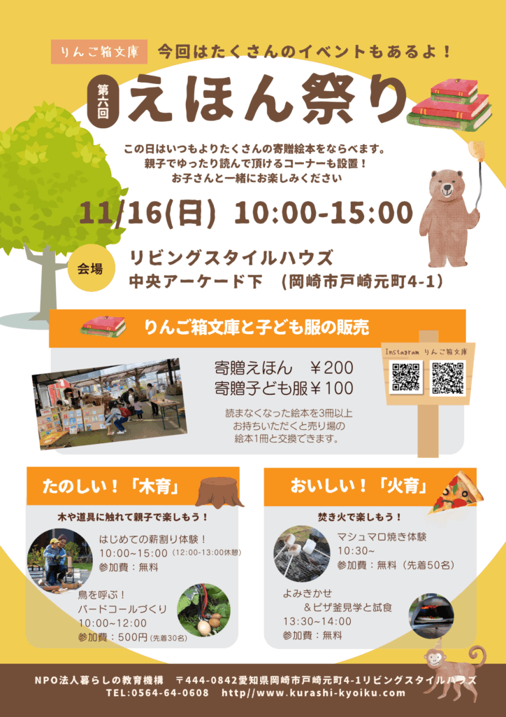 秋の気持ちのいい季節。ハウズアーケード下にご寄贈いただいた絵本を並べて販売する「えほん祭り」を開催します。今回は、ハウズさんの協力も得て、木育コーナーと火育コーナーも設置します。マシュマロやピザを食べたり、バードコールを作ったり。親子で一緒に身近な自然と触れ合い、絵本を読むゆったりとした時間をお楽しみください。