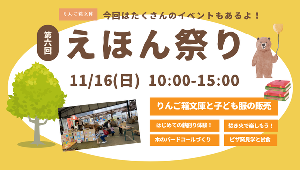 秋の気持ちのいい季節。ハウズアーケード下にご寄贈いただいた絵本を並べて販売する「えほん祭り」を開催します。今回は、ハウズさんの協力も得て、木育コーナーと火育コーナーも設置します。マシュマロやピザを食べたり、バードコールを作ったり。親子で一緒に身近な自然と触れ合い、絵本を読むゆったりとした時間をお楽しみください。
